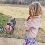 She’s already making great strides—she figured out the doggy door all on her own. I let her outside to potty, and when I came back a few minutes later, she wasn’t out there. I went to check her kennel and found her happily inside, playing with a few toys she must have picked up on her way back!